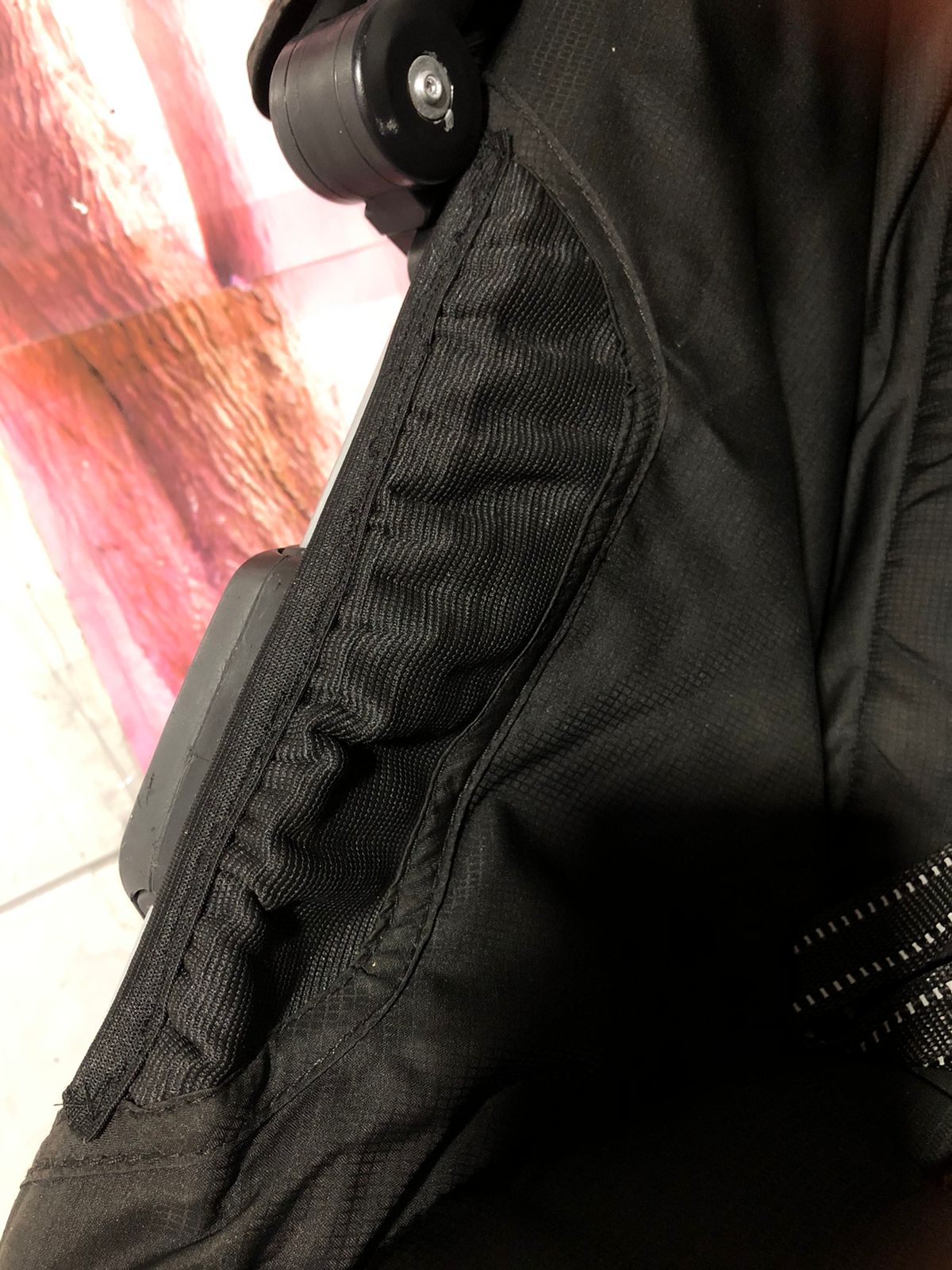 – Tem amortecedor na rodinha da frente, o que minimiza os impactos de pisos irregulares